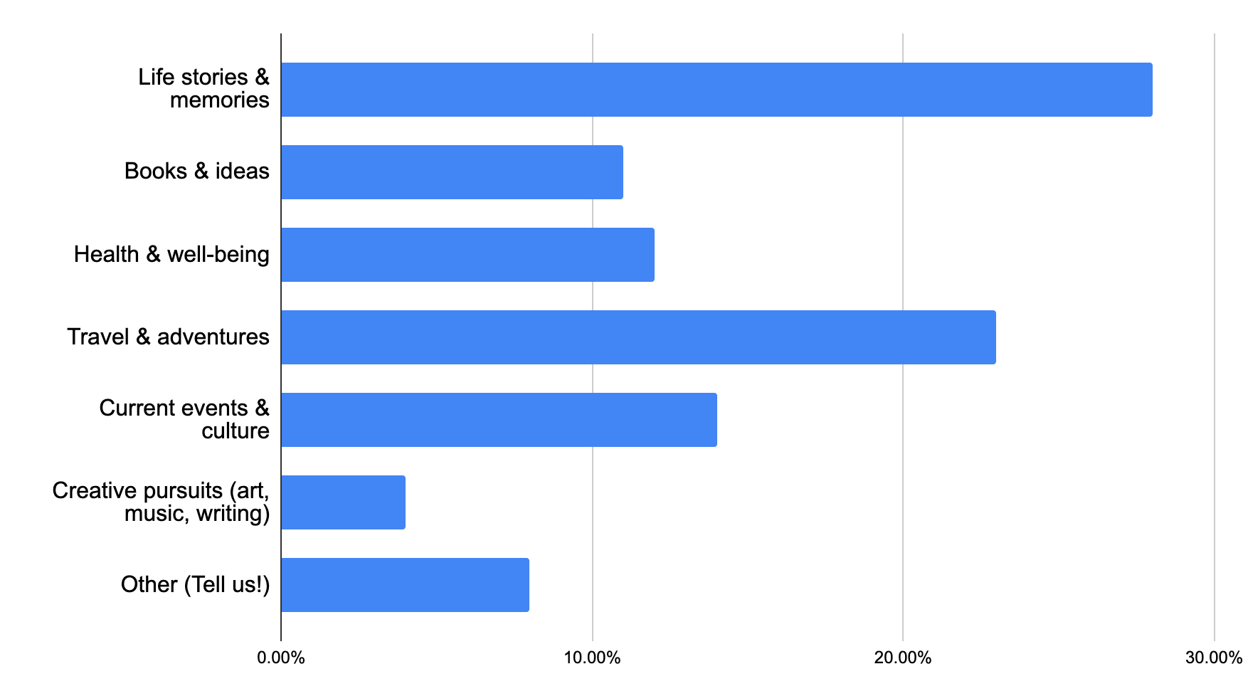 Life stories and memories came out on top, showing that what people really want most is the chance to share where they’ve been and what they’ve lived through. Travel and adventures were a strong second, proving that curiosity and wanderlust don’t fade with age. Overall, the results show a beautiful mix of reflection and forward-looking interest—people want to honor their past, stay engaged with the world, and keep learning and growing together.