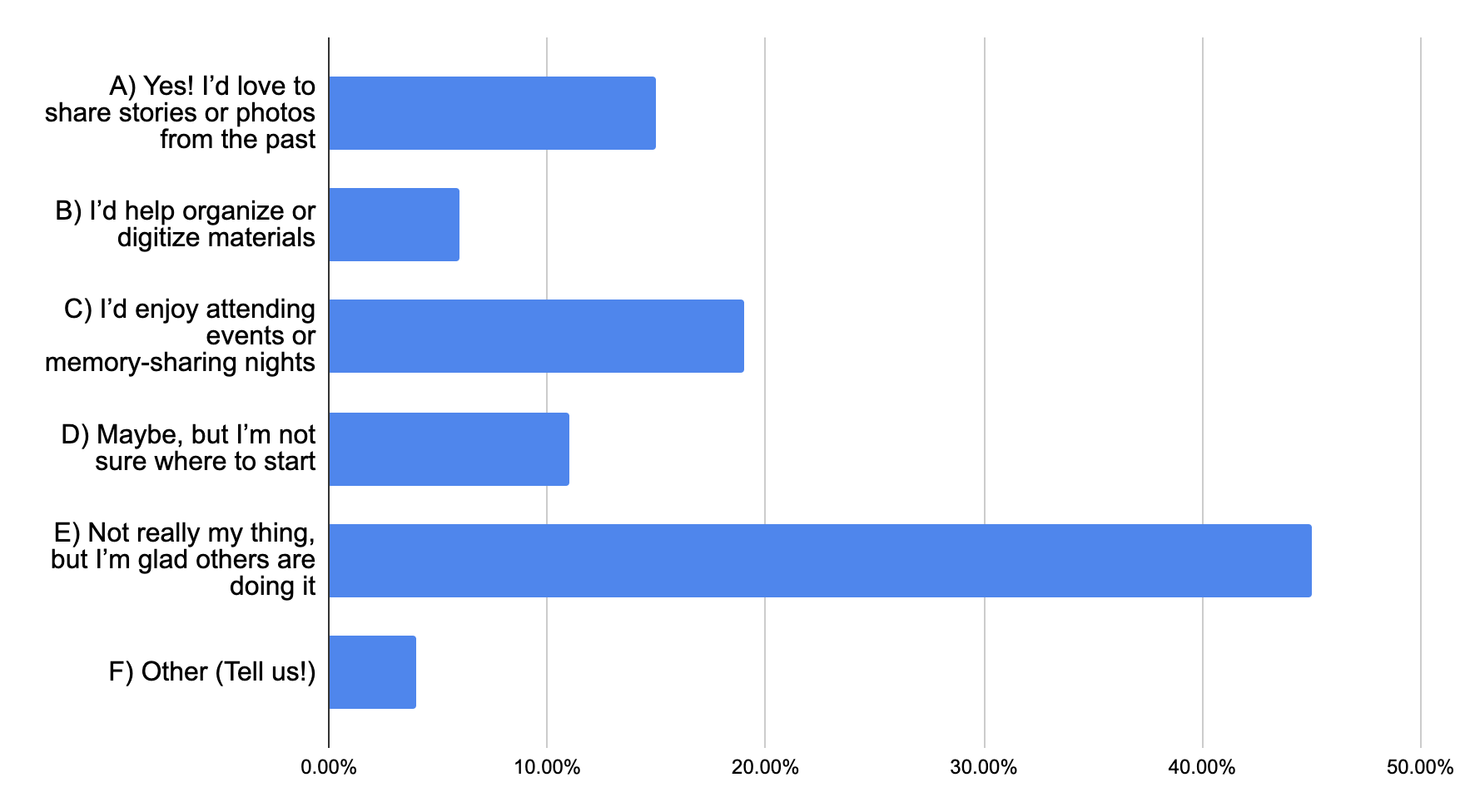 When it comes to preserving local history, our poll shows a mix of curiosity and gratitude. While 15% of respondents would love to share personal stories or photos, and 19% are interested in attending memory-sharing events, the largest group—45%—said it’s not really their thing, but they’re glad others are keeping the past alive. A smaller group (6%) is willing to help organize or digitize materials, while 11% aren’t sure where to start. Overall, the results highlight that while not everyone wants to dive in hands-first, there’s strong support for keeping community memories alive.
