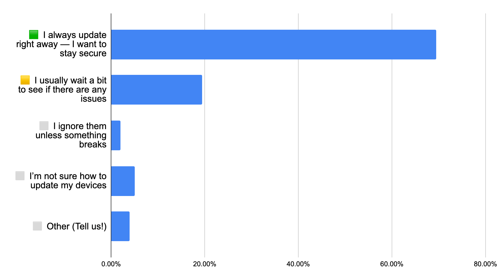 Looks like most of you don’t wait when it comes to staying secure—nearly 70% of readers said they install software updates right away! Whether it’s about protecting your personal data or keeping devices running smoothly, staying current clearly matters. Still, a thoughtful handful prefer to wait and see, and a few brave souls ignore the alerts altogether (you know who you are!). Thanks to everyone who weighed in—your feedback helps us better understand how our community navigates the digital world.