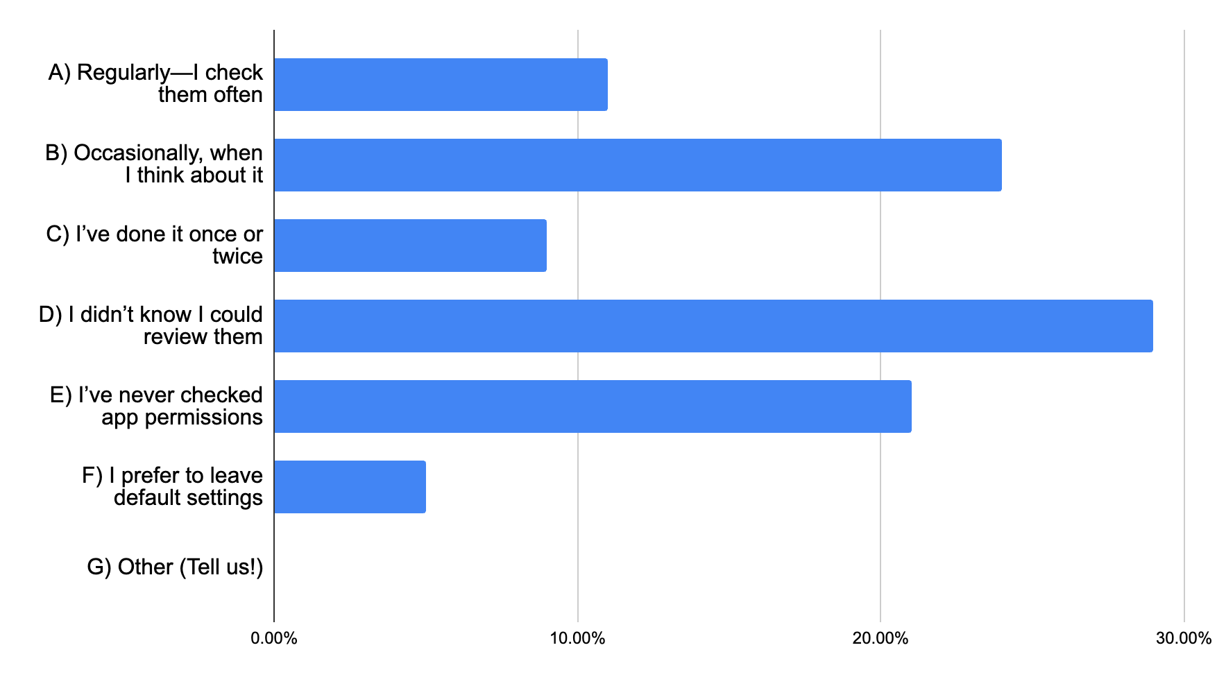 App permissions aren’t something most readers check regularly. The largest group said they didn’t even realize these settings could be reviewed, and many others shared they’ve never looked at them at all. A smaller portion checks occasionally, while only a handful said they review permissions often. Overall, the responses suggest this is an area where simple awareness can go a long way—once people know these controls exist, it becomes much easier to make small adjustments that improve privacy and reduce unnecessary access.