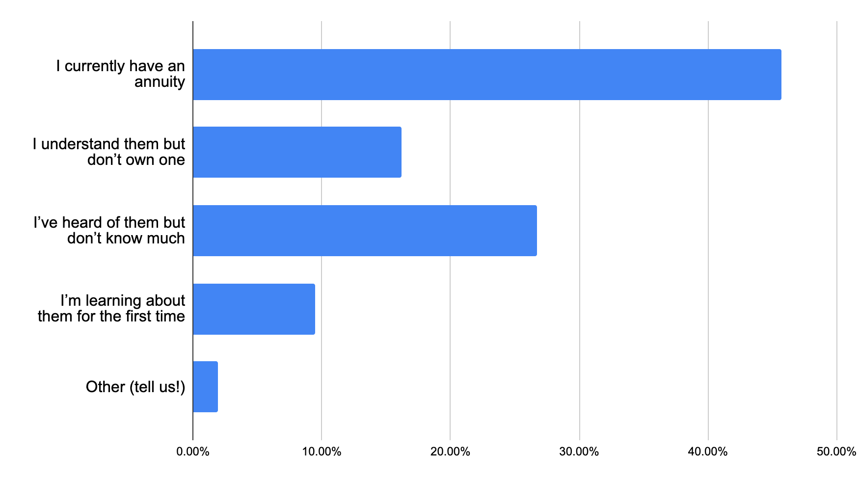 A smaller group—9.5%—said they are learning about annuities for the first time, while just 1.9% selected “Other.” Overall, the results highlight both widespread adoption and ongoing curiosity, suggesting that clear explanations of annuities, including their pros, cons, and payout options, remain valuable for readers planning their financial future.
