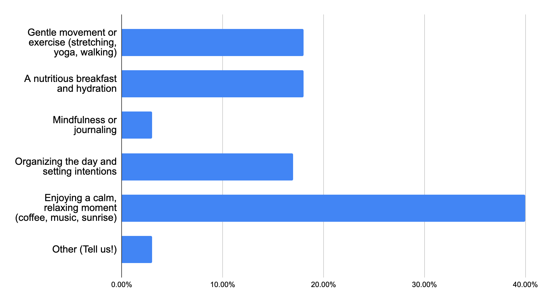 When it comes to morning routines, a sense of calm clearly takes center stage. The largest group of respondents prefers easing into the day with a relaxing moment—whether that’s coffee, music, or simply watching the sunrise—suggesting that peace and presence matter most. While movement, nutrition, and planning all share fairly equal importance, mindfulness practices lag behind, indicating that for many, a gentle, comforting start feels more appealing than a structured or reflective one.