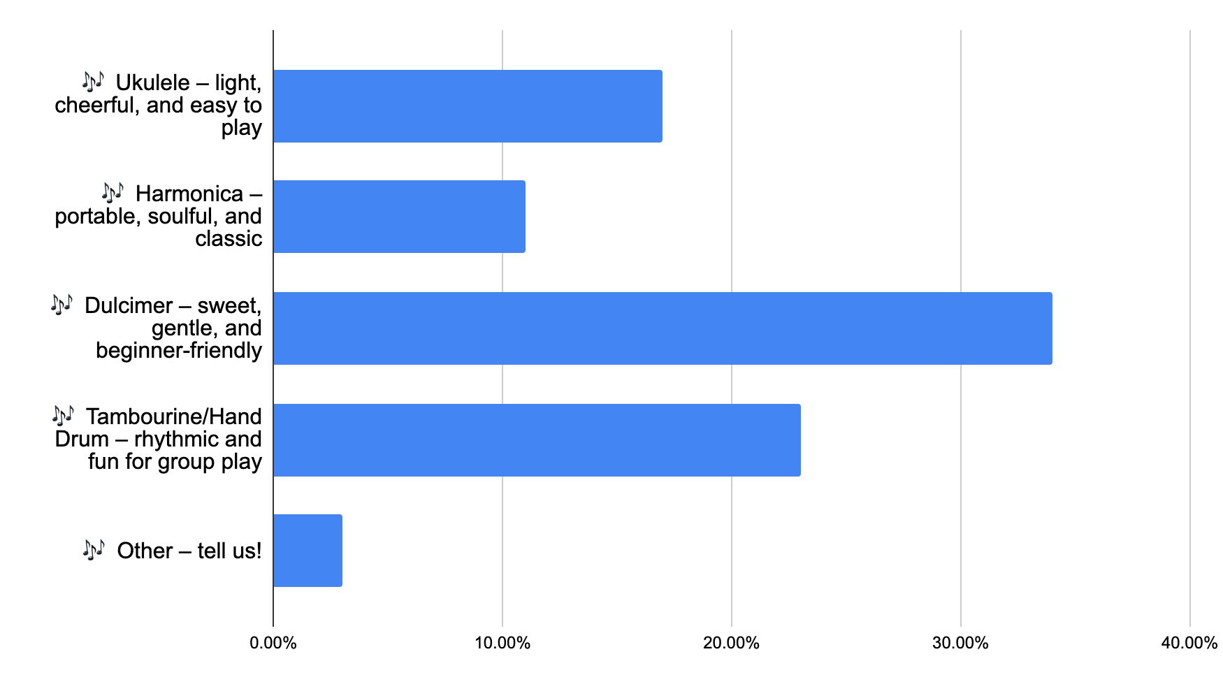 🎶 The results are in! The dulcimer struck the sweetest chord, winning by a wide margin with 34% of the votes. The tambourine/hand drum came in second at 23%, proving that rhythm really brings people together. Meanwhile, the ukulele’s cheerful strum (17%) and the harmonica’s soulful sound (11%) also found fans, with a few readers (3%) dreaming of other instruments altogether. Clearly, folk music has something for everyone!