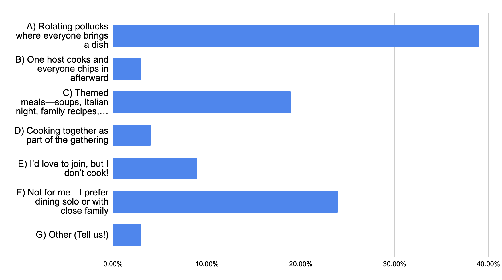 The results are in—and potlucks reign supreme! 39% of respondents said they’d love a rotating potluck-style dinner club where everyone brings a dish, proving that shared meals and shared effort are a winning combo. Themed meals like “Italian Night” or “Family Recipes” came in next with 19%, while nearly a quarter (24%) said they prefer to dine solo or with close family. Whether you’re a social butterfly or a quiet foodie, it’s clear that breaking bread can take many delicious forms.