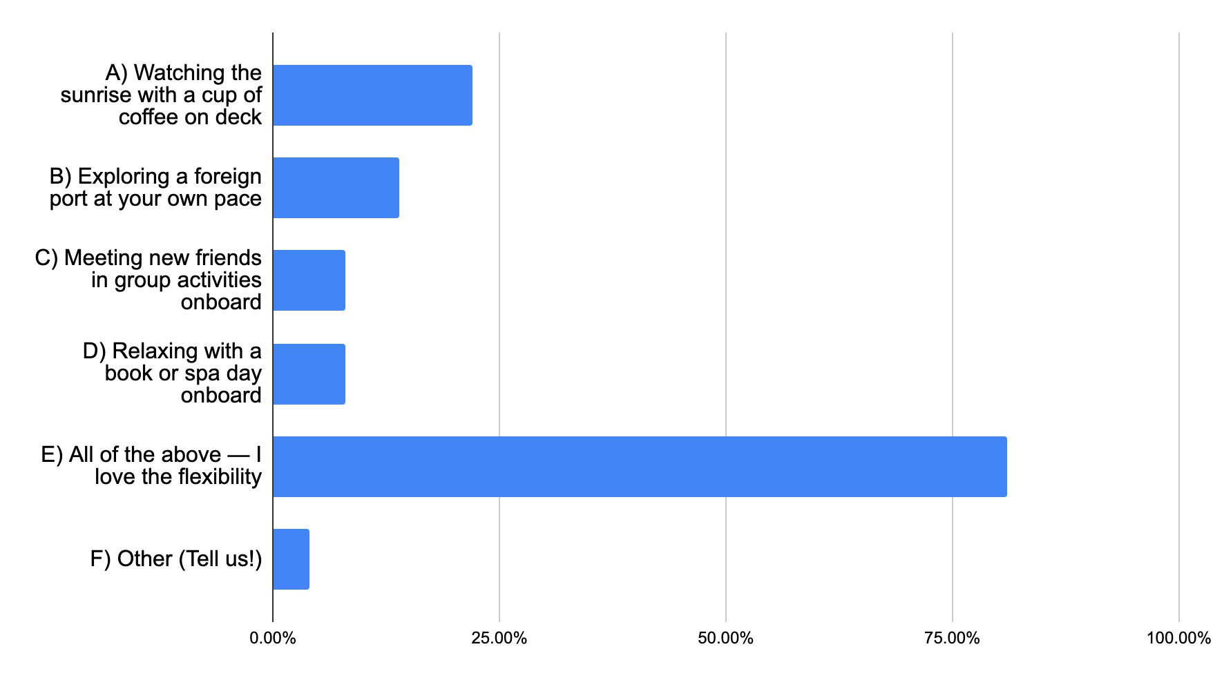 Cruisers have spoken — and flexibility wins by a landslide! An overwhelming 81% of voters chose “All of the above” as their ideal solo cruise moment, showing that independent travelers love having the freedom to switch between adventure, relaxation, and quiet reflection. Sunrise coffee on deck (22%) and exploring ports solo (14%) were the next most popular choices, proving that peaceful moments and personal exploration still rank high. Overall, the results highlight what makes solo cruising so appealing: you get to shape each day exactly the way you want.