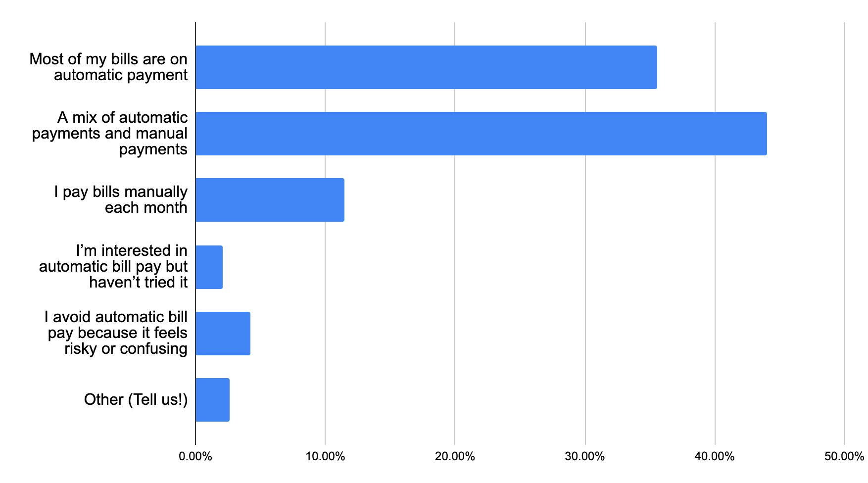 Most respondents are already comfortable using automatic bill pay in some form, with the largest group managing a mix of automatic and manual payments. A strong portion have fully embraced automation, showing growing trust in digital financial tools and convenience-based money management. Only a small minority still handle all bills manually or avoid auto-pay due to concerns, suggesting that hesitation is becoming less common. Overall, the results reflect a clear shift toward automation—people want simplicity, reliability, and less monthly stress when it comes to managing their finances.
