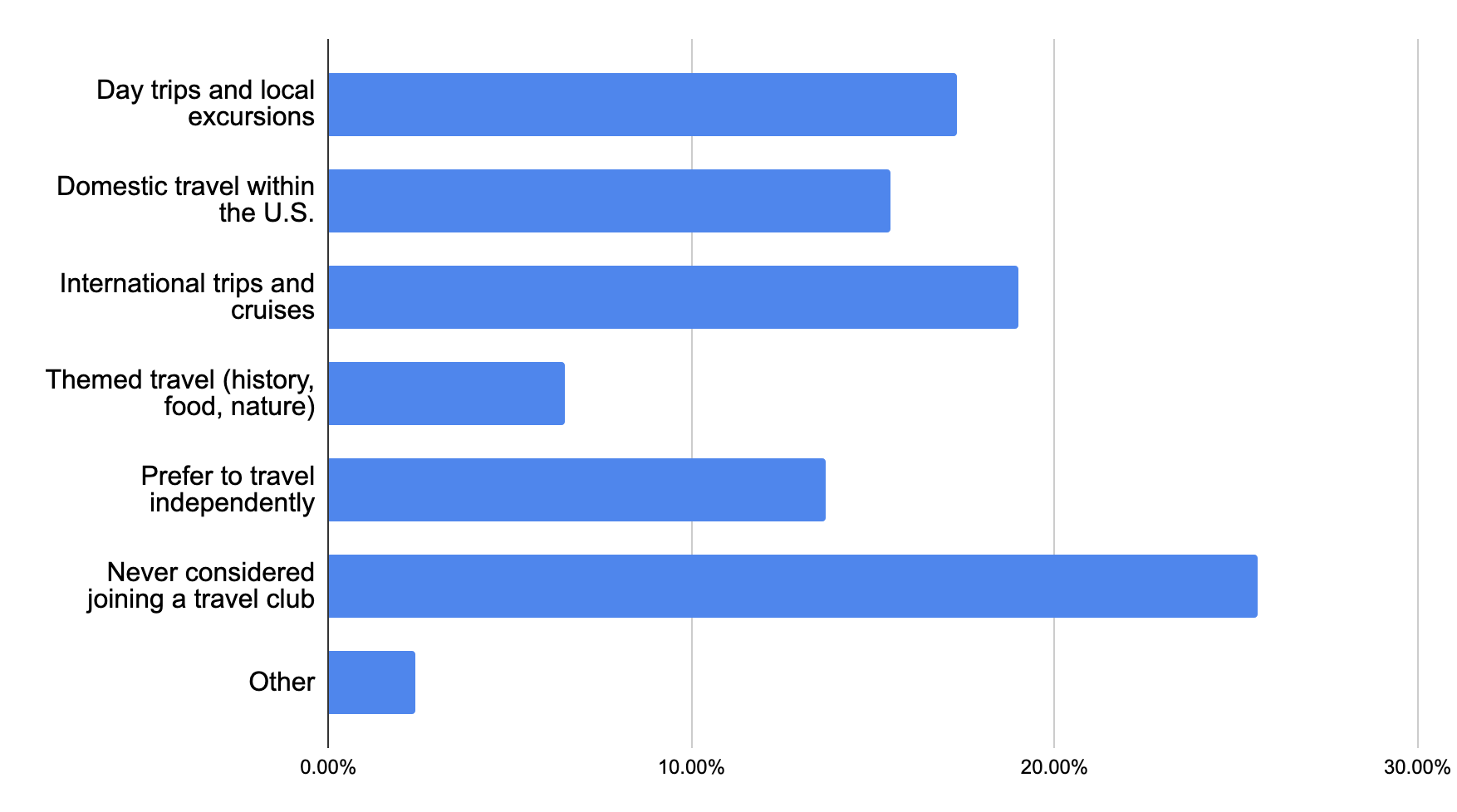 These results suggest that while curiosity about travel clubs is growing, many people are still in the early “considering it” stage. The largest group—over a quarter of respondents—said they’ve never thought about joining a travel club at all, pointing to a big opportunity for awareness and education. Among those who are interested, international trips and cruises lead the way, followed closely by day trips and domestic travel, showing a healthy mix of wanderlust and practicality. Notably, a meaningful number of respondents prefer to travel independently, highlighting that flexibility remains important. Overall, the poll reflects a community that values travel—but wants clear benefits, comfort, and choice before committing to a group experience.