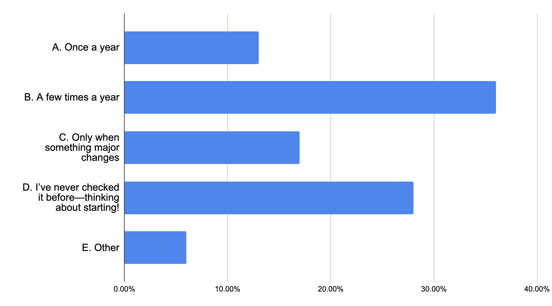 Most respondents keep an eye on their financial picture at least a few times a year, making that the leading habit by a comfortable margin. A significant group shared that they’ve never checked their net worth before but are thinking about starting—a great sign of growing financial awareness. Others prefer checking only when major life events happen, while a smaller portion reviews theirs annually or follows their own unique approach.