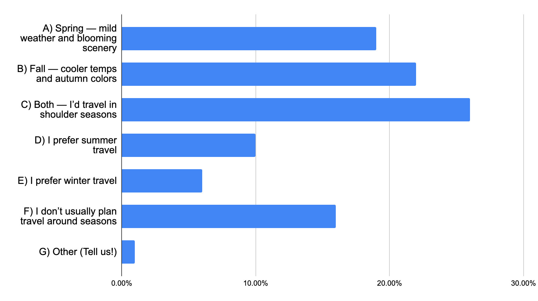 Mild weather clearly wins the day, with the largest group saying they’d happily follow both spring and fall to enjoy the comfort of the shoulder seasons. Fall edges out spring slightly, suggesting many readers are drawn to crisp air and colorful leaves, while spring still shines with blooming scenery and gentle temperatures. Only a smaller share prefers the heat of summer or the chill of winter, and a noticeable group said they don’t usually plan travel around the seasons at all. Taken together, it paints a simple picture: when it comes to travel, many readers aren’t chasing extremes — they’re chasing comfort, beauty, and a trip that just feels easy.