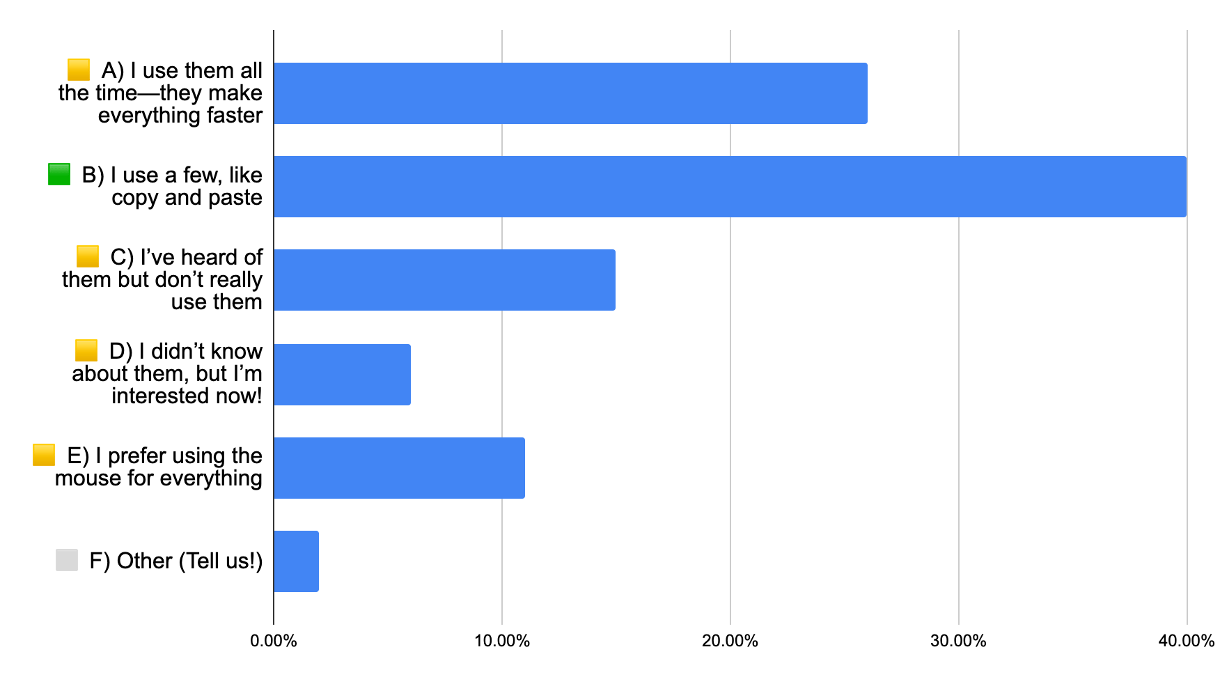 Turns out most of us are at least dabbling in the shortcut life! A solid 40% of respondents say they regularly use a few trusty commands—like copy and paste—to get things done. Another 26% have gone full pro-mode, zipping through tasks with an arsenal of shortcuts at their fingertips.