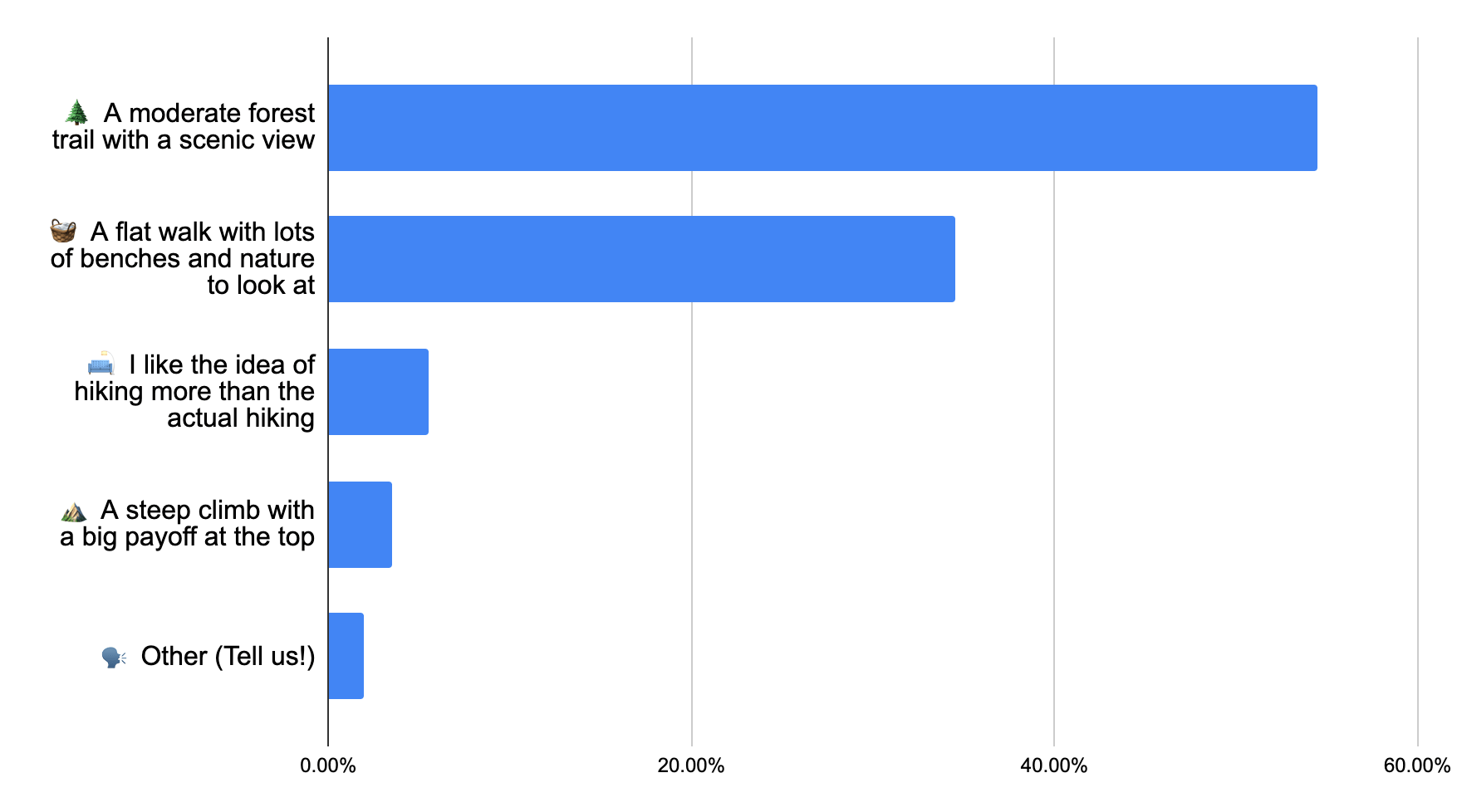 Looks like our readers love a trail with just the right amount of challenge—over half of you voted for a moderate forest hike with a scenic view at the end! For those who prefer a gentler pace, a good number of folks opted for flat walks with plenty of nature and resting spots. A few brave souls are all about the big climb and panoramic payoffs, while others admit the idea of hiking might be more fun than the actual doing (no shame in that!). Thanks to everyone who chimed in—it’s always a treat to hear what gets you outside and moving.