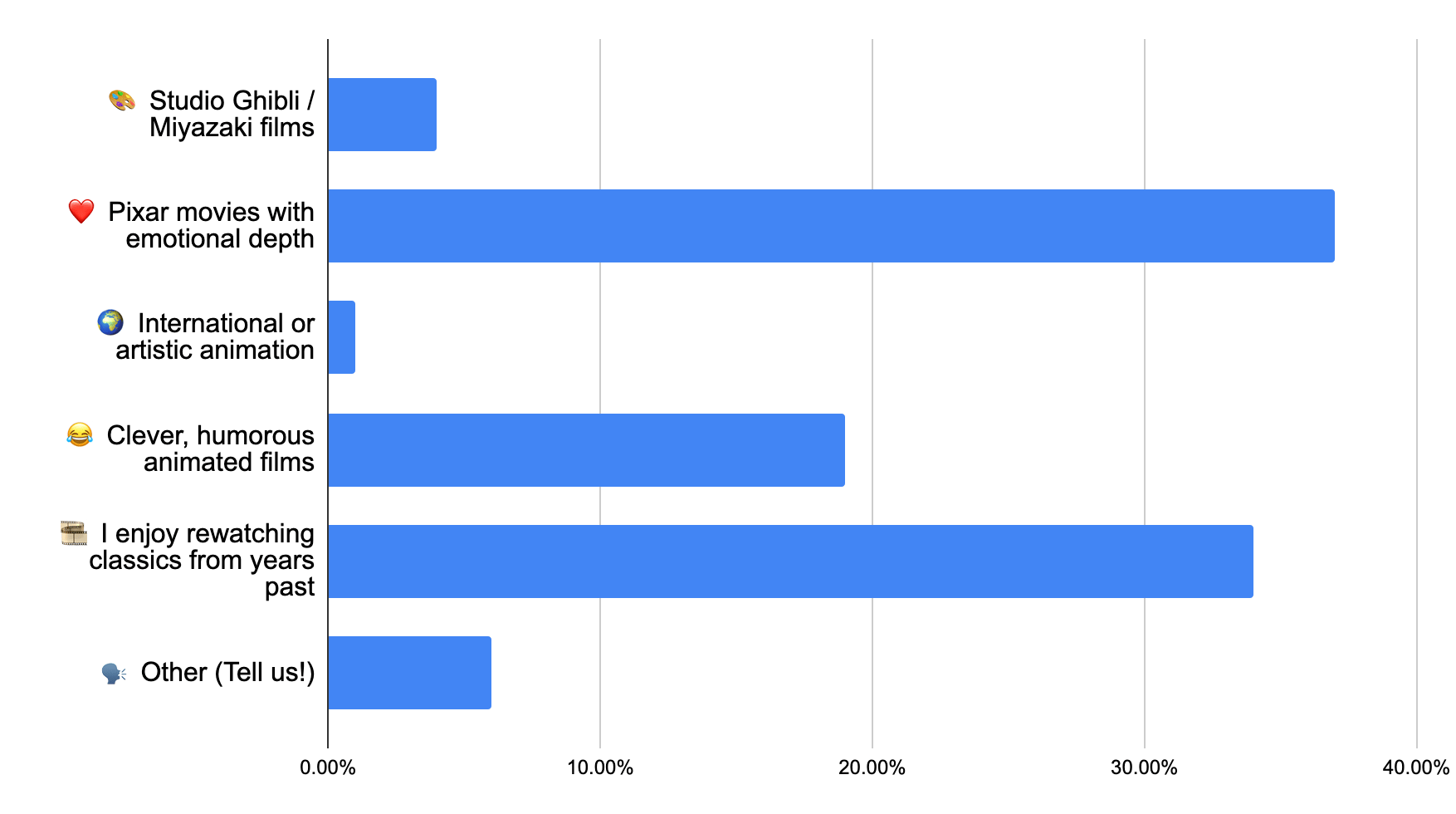 These results make it clear that animated films hold a special place in adult hearts—especially the ones that bring real emotion and nostalgia. Pixar leads the way, with many readers drawn to stories that are heartfelt, thoughtful, and surprisingly moving. Close behind, a large number of respondents said they love revisiting classic animated favorites from years past, showing that these films remain comforting and timeless no matter your age.