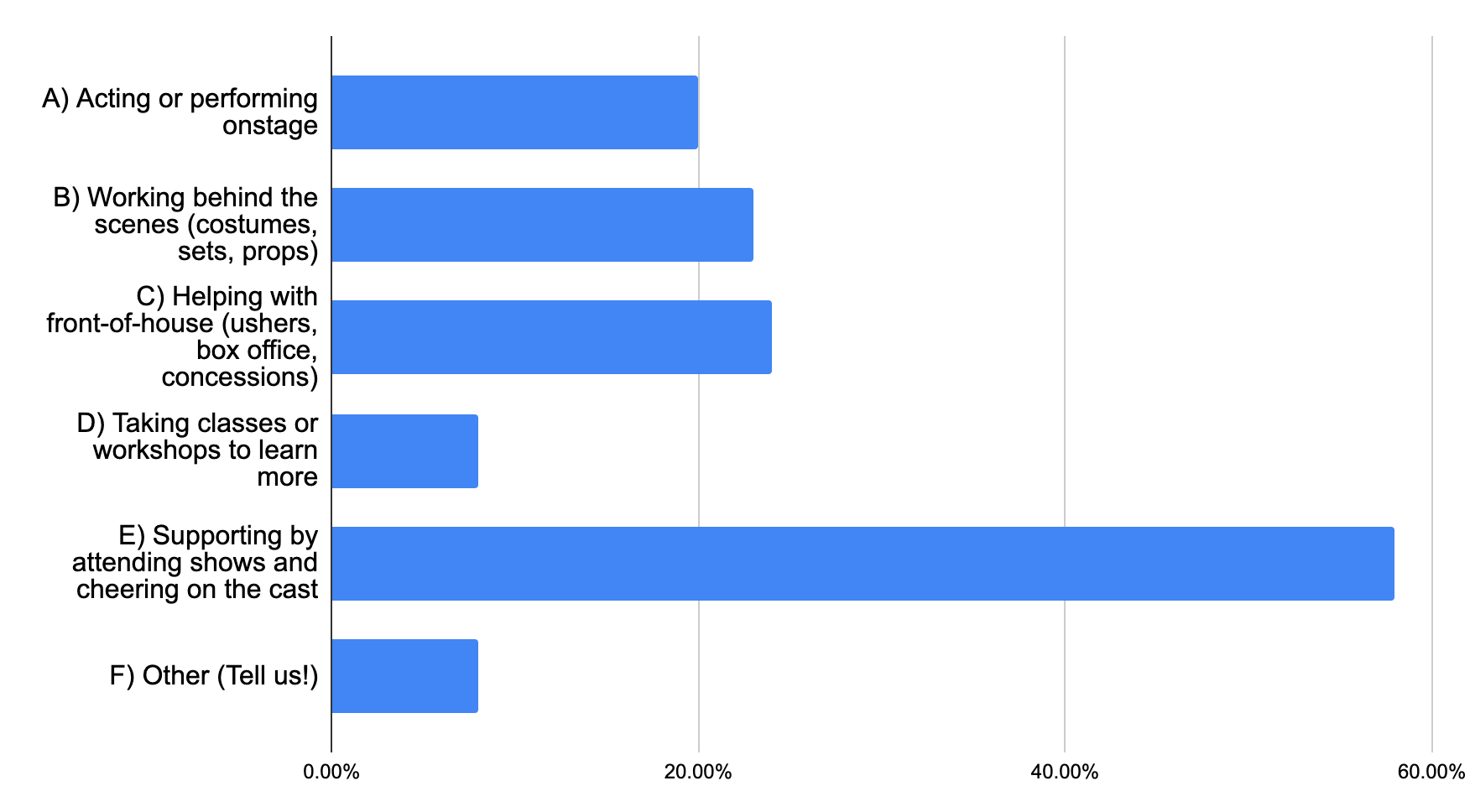 It looks like the community spirit is strong! Most readers — a big 58% — said their ideal role in community theater is simply showing up, supporting the cast, and cheering everyone on. A close second at 24% were those excited about front-of-house roles like ushering or helping at the box office, showing that many enjoy being part of the experience without the spotlight. Meanwhile, 23% were drawn to the creative magic happening behind the scenes, working with costumes, sets, or props. And for the performers at heart, 20% said they’d love to act onstage, while 8% are interested in taking classes or workshops, and another 8% prefer “something else.” Overall, it’s clear that community theater offers something for everyone — both in front of the curtain and behind it.