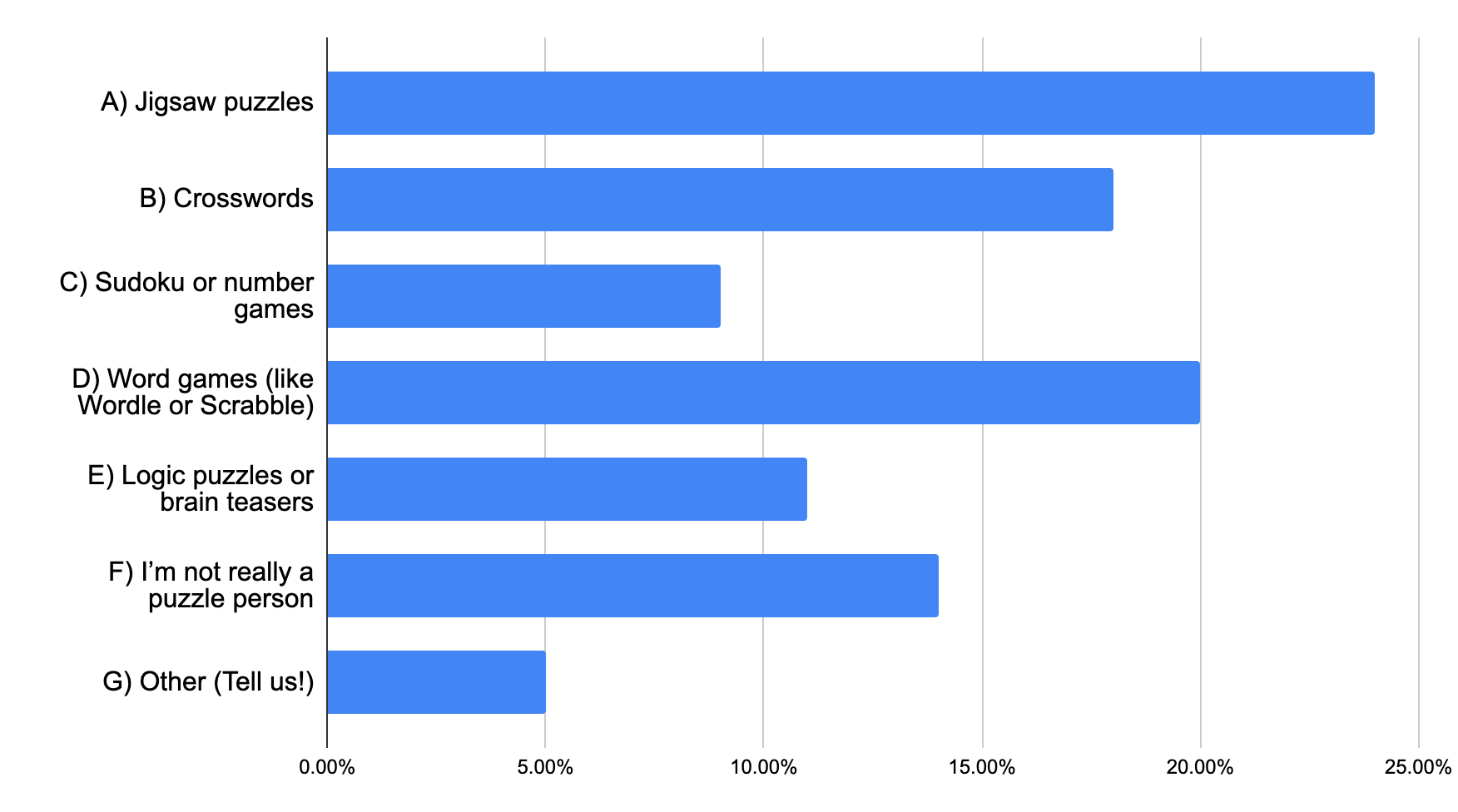 Jigsaw puzzles came out on top in our recent poll, with 24% of respondents saying they’re their favorite brain workout. Word games like Wordle and Scrabble followed close behind at 20%, proving that wordplay still holds a special place in many hearts. Crosswords (18%), logic puzzles (11%), and number games like Sudoku (9%) also had solid followings—while 14% admitted they’re not really puzzle people. And a curious 5% said “other,” which makes us wonder... Rubik’s cubes? Riddles? Let us know!