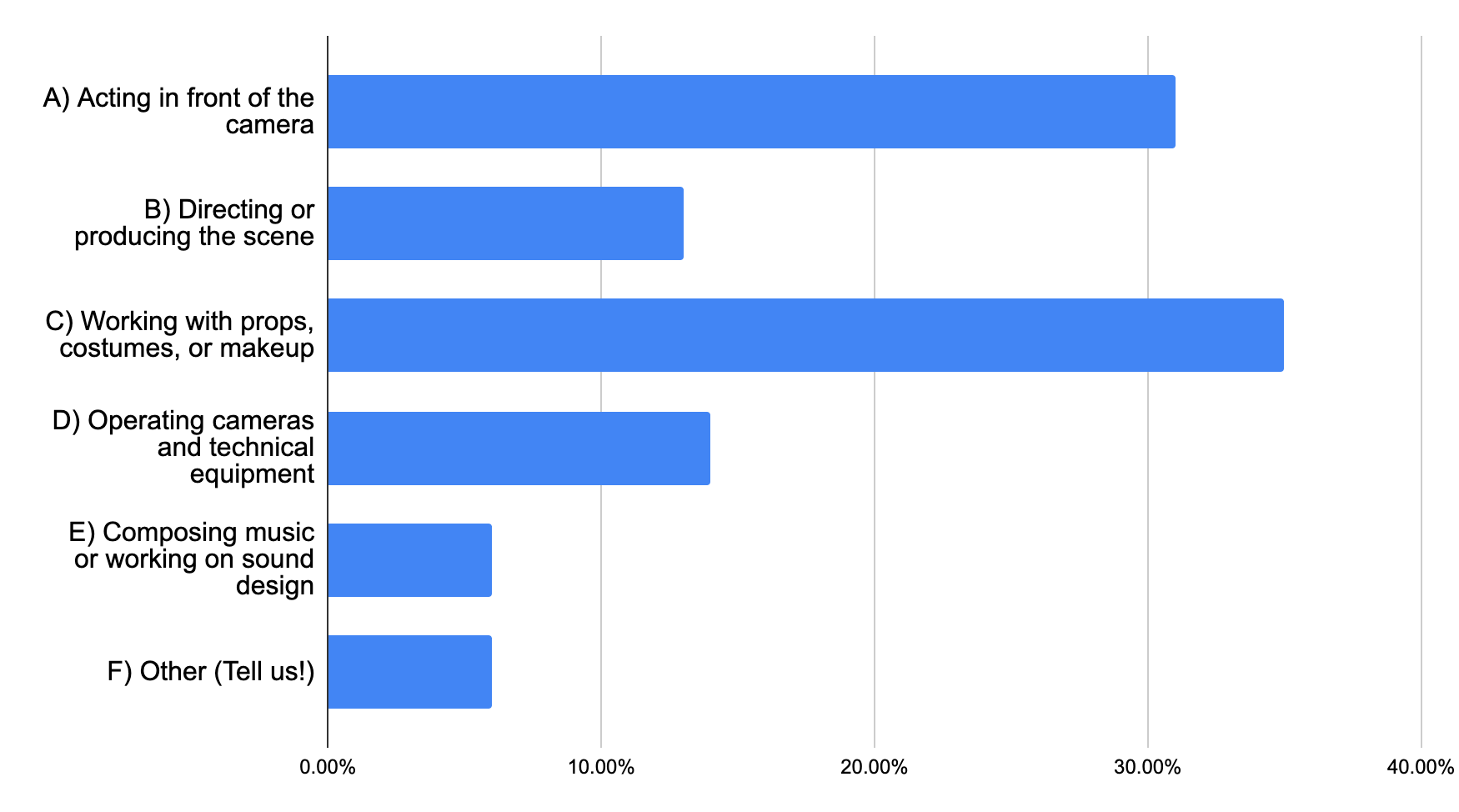 It looks like the behind-the-scenes magic is what truly captures everyone’s imagination! With 35% of the vote, the top choice was working with props, costumes, or makeup — clearly, the creative craftwork that brings characters to life is a major fascination. Close behind, 31% of respondents said they’d love to act in front of the camera, proving the spotlight still has its allure. Technical roles like camera operation and directing or producing drew solid interest too, each earning 14% and 13%, respectively. And while sound design and music gathered a smaller 6%, it still holds a special place for those who appreciate the artistry of audio. A final 6% chose Other, showing there’s no shortage of curiosity when it comes to exploring movie-magic from all angles.