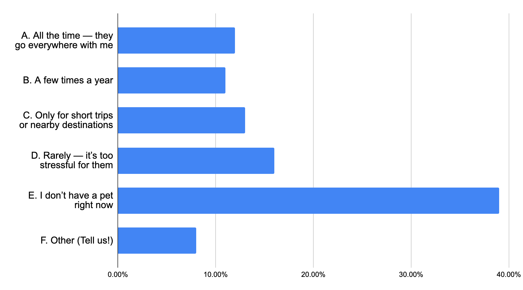 The largest group of voters (39%) shared that they don’t currently have a pet, which naturally shapes their travel routines. Among pet parents, views are mixed: 16% say traveling with their furry friend is just too stressful, while smaller groups take a more flexible approach — 13% only bring pets along for short or local trips, and 11% venture out together a few times a year. And then there’s the devoted crew: 12% of you said your pets are constant companions, joining you on nearly every outing. A final 8% had unique travel habits that didn’t fit neatly into any category. It’s a reminder that every pet — and every traveler — has their own comfort zone.