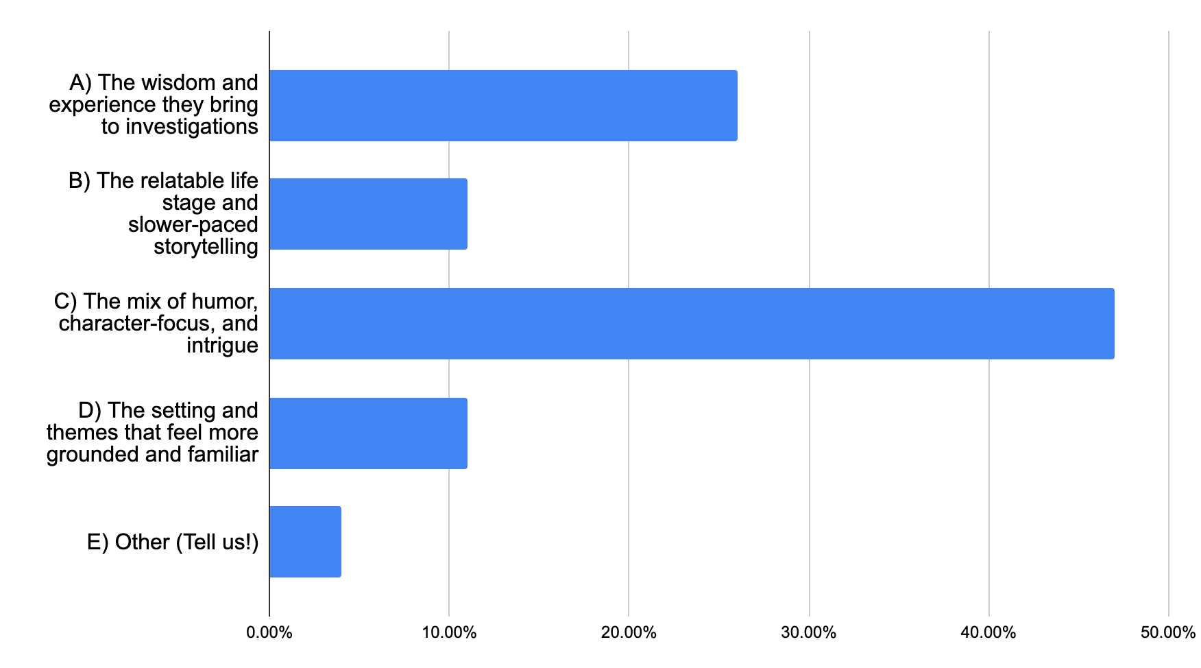 In our recent poll, nearly half of readers (47%) said they love mysteries with older protagonists for the perfect blend of humor, character depth, and clever twists. Another 26% appreciate the wisdom and life experience these sleuths bring to each case—no magnifying glass needed! Meanwhile, 11% connect with the more relatable pace and life stage, and another 11% enjoy the familiar, grounded settings often featured in these stories. Only 4% had something else in mind, proving that for many, the golden years make for golden whodunits.